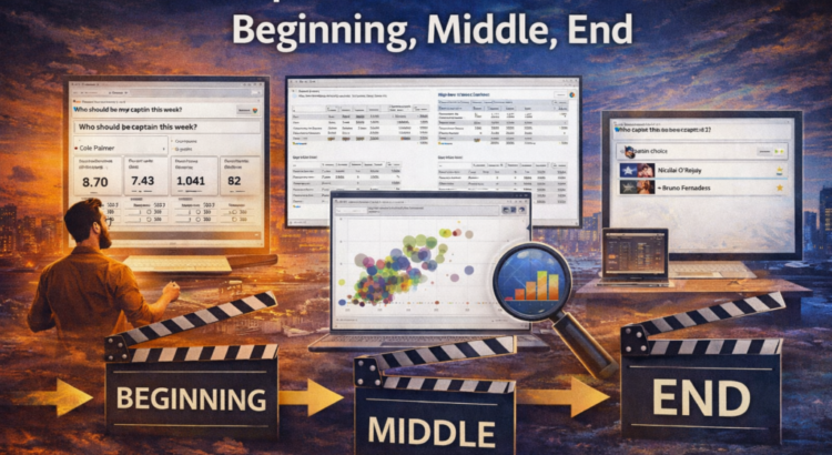 Yours FPL captain’s choice is the most important decision you make every gameweek. This post applies the start–middle–end reporting framework to my Fantasy Premier League Power BI report and shows how to design it to provide clear recommendations.